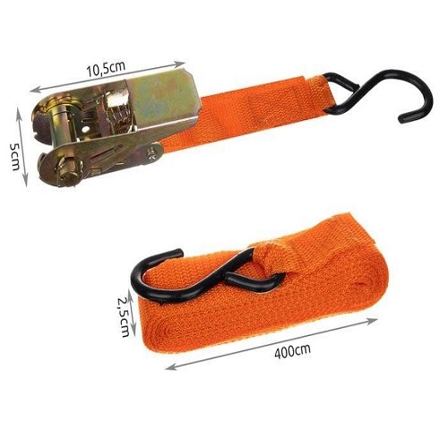 A készlet 2 db hevederszíjat tartalmaz, horoggal és feszítővel (csörgővel) felszerelve. Ezek az elemek biztosítják a rakomány stabil és biztonságos szállítását minden körülmények között.