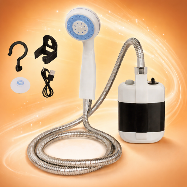 Az AquaTrail hordozható kemping zuhany praktikus és sokoldalú megoldást kínál, ha a természetben, utazás közben vagy a kertben szeretnél gyorsan és kényelmesen zuhanyozni. A kompakt kialakítás és az akkumulátoros működés lehetővé teszi, hogy bárhol frissítő zuhanyt vegyél – akár kempingezés, túrázás vagy strandolás közben is.