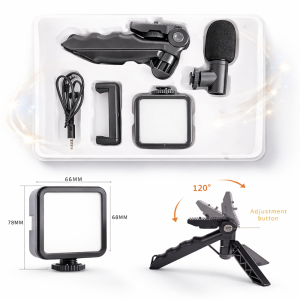 A készlet egy mikrofont, LED videólámpát, rugalmas állványt és univerzális telefontartót tartalmaz, így tökéletes megoldás vlogoláshoz, élő közvetítéshez, YouTube vagy TikTok videók készítéséhez, valamint online tartalomgyártáshoz.