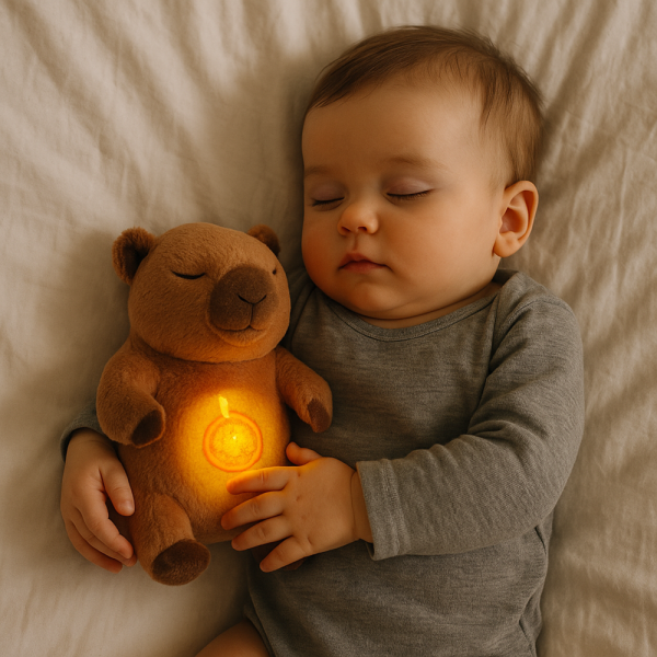 A capybara – a világ legbarátságosabb állataként ismert – most bájos plüss formában, légző mozgást imitáló funkcióval és kellemes, halk környezeti fénnyel segíti a legkisebbeket az elalvásban. A plüss játék finoman emelkedik és süllyed, utánozva a lélegzést, ami megnyugtatja a babát, és elősegíti a természetes, lassú légzésritmust.