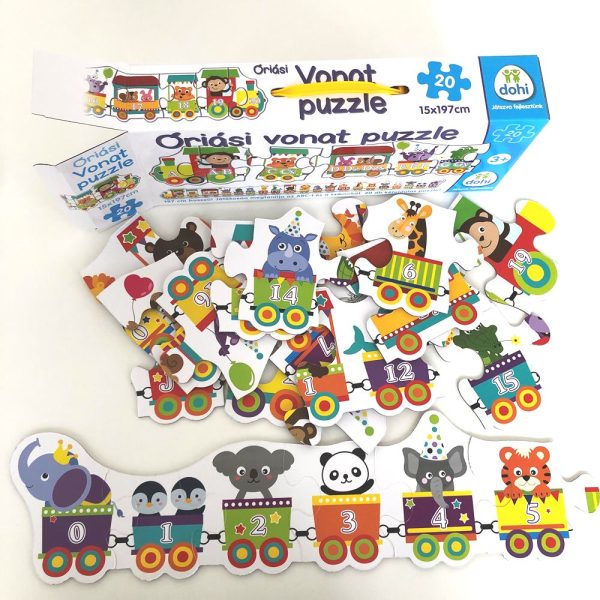 A vonat mindkét oldalán kedves figurák láthatók. Az egyik felükön az ABC betűivel, a másikon pedig számokkal ismerkedhettek. Nagy segítséget jelenthet a kirakás folyamán a doboz hátulján lévő két ábra.