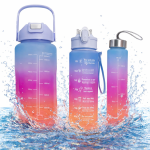 Háromrészes motivációs kulacs szett, kék-lila-narancssárga színkombinációban, 2L, 900 ml és 300 ml méretű palackokkal