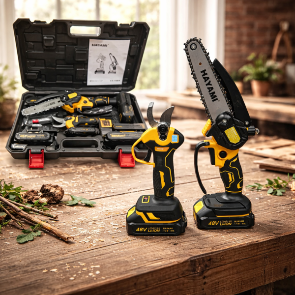 HAYAMI HA-1004 akkus metszőolló és mini láncfűrész szett – LCD kijelző, 6” olajzós láncfűrész, 2 akkumulátorral (FX)