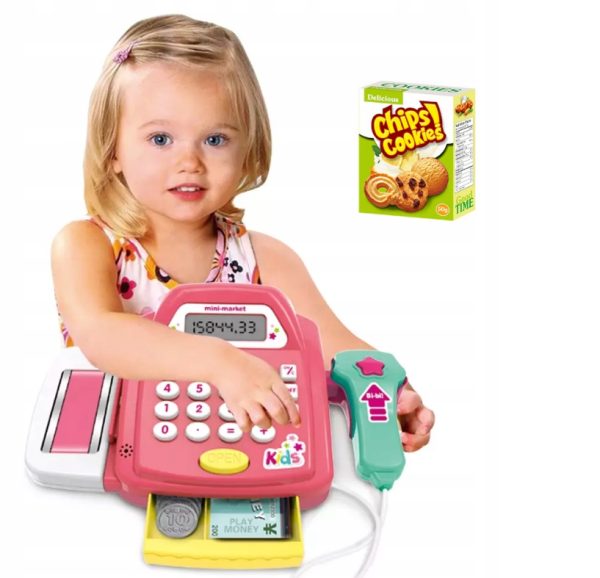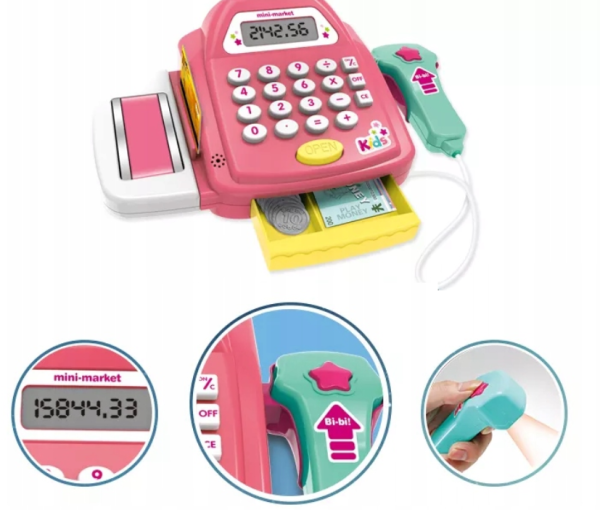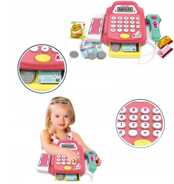 - Szkenner és számológép: A pénztárgép szkennerrel és működő számológéppel van felszerelve, így a gyerekek gyakorolhatják a számolást és a pénz kezelést.