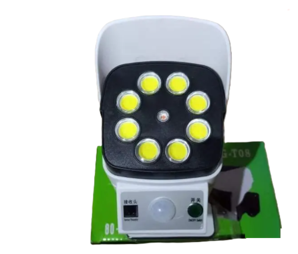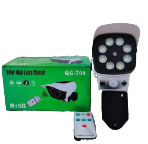 Kültéri solar napelemes mozgásérzékelős 77 LED-es lámpa és álkamera táviránytóval QG-T08 (BBL)