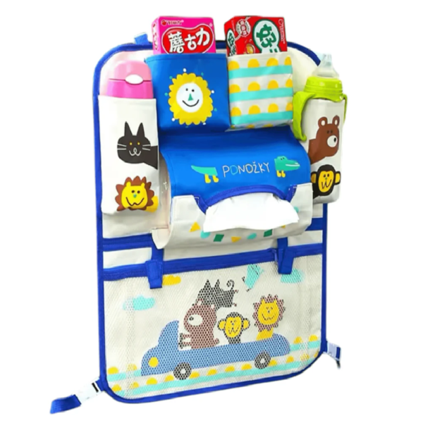 Ez a kék színű, vidám mintájú háttámla rendező nemcsak praktikus tároló, hanem egyben szórakoztató kiegészítő is, amely a gyerekeket a mesék világába repíti már az utazás első percétől 🎨📖.