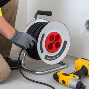Flinke/Hitman 50m kábeldob – 3×2,5mm hosszabbító, 4 aljzattal és biztonsági kapcsolóval masszív kivitel (BBD)